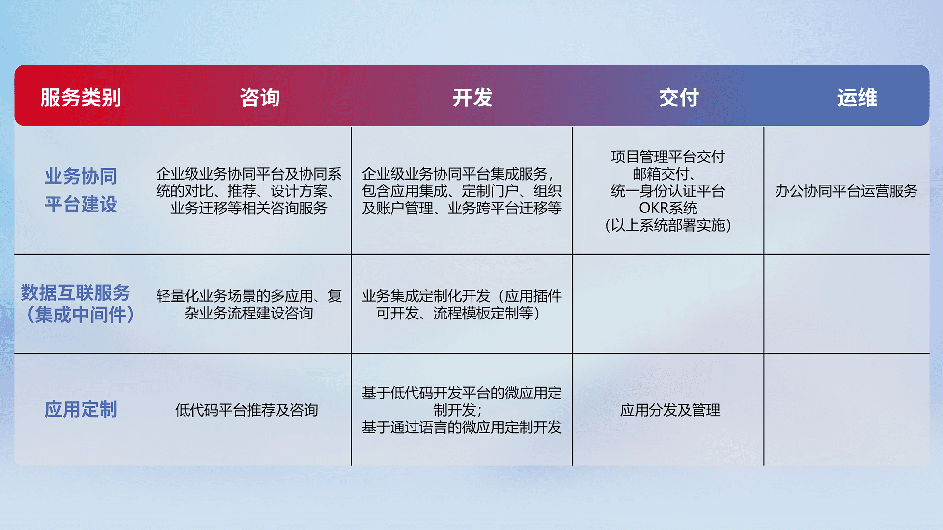 基于全代码低代码的数字化应用系统开发及交付,,满足特定业务场景的应用开发及集成,,,提升企业业务信息化及数字化能力。。
