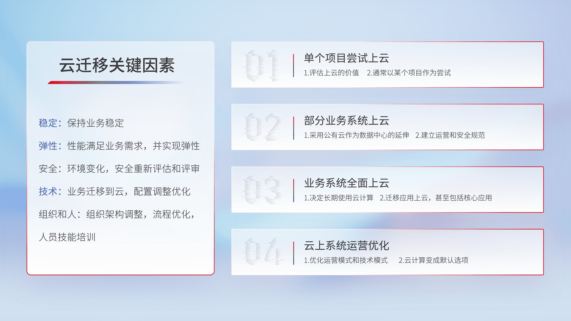 结合实际业务,,,从规划设计、、云平台选型、、、云原生改造、、数据迁移、、、集成交付,,迁移全过程为客户识别最佳上云路径,,,,做好风险识别管理,,,设计网络架构、、身份权限、、安全审计合规、、操作审计、、、、日志审计、、监控告警策略、、多站点容灾设计等,,对云上基础设施进行整体规划,,提升IT治理水平,,,以满足弹性、、高可用、、、高性能的需求。。。。