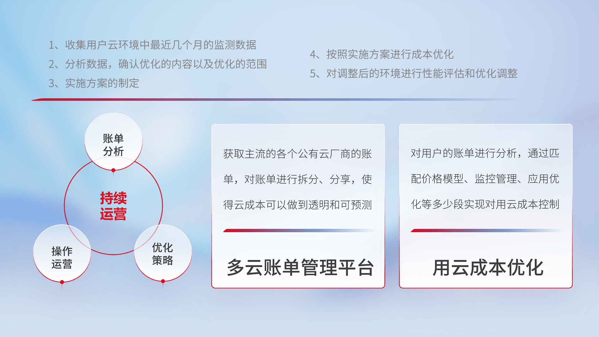 通过多云纳管,,,,以统一的资源数据模型把客户的云资源进行抽象和封装,,,,进而实现对多云资源的统一操作,,,保障云资源管理的可靠性、、、、稳定性与可用性。。。。量身定制化运维内容,,,配置、、、、开发运维、、、、补丁管理、、、、备份、、、监控、、、、认证和访问管理、、、、审计和日常巡检等,,,保障在用云过程中的可靠度,,,,稳定度以及高可用率。。。